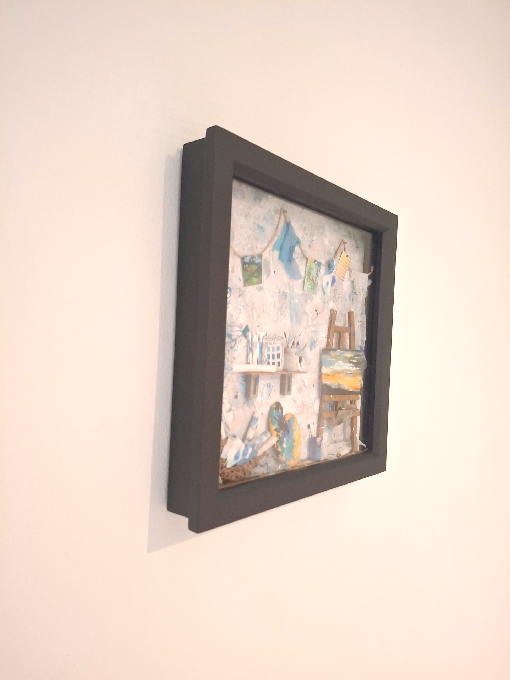 A handmade miniature artists studio diorama housed in a glass fronted boxed frame. Only one is available.