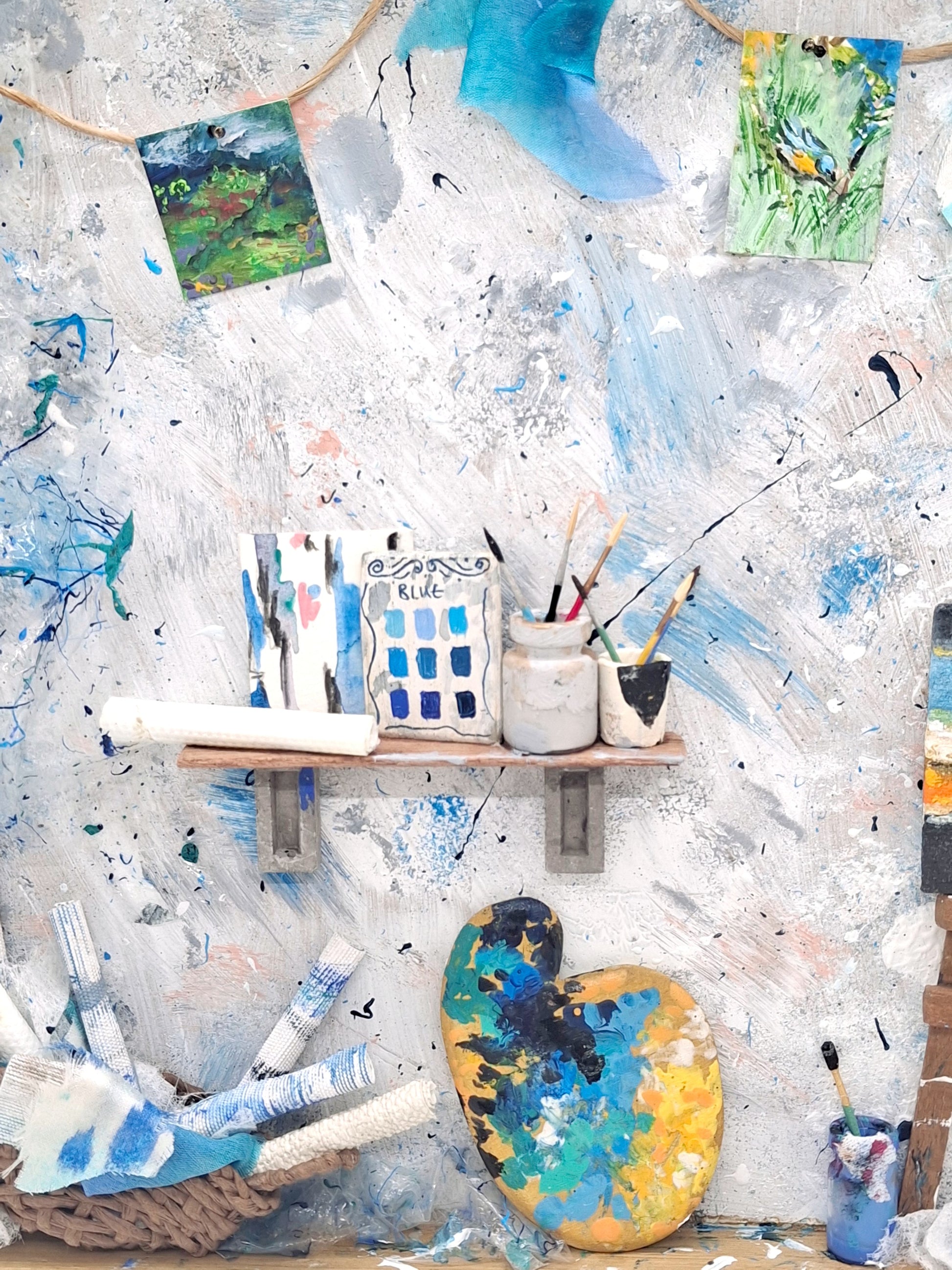 The intricate artists scene contains an original miniature canvas artwork, handmade wooden easel, paint palette, shelving and more.