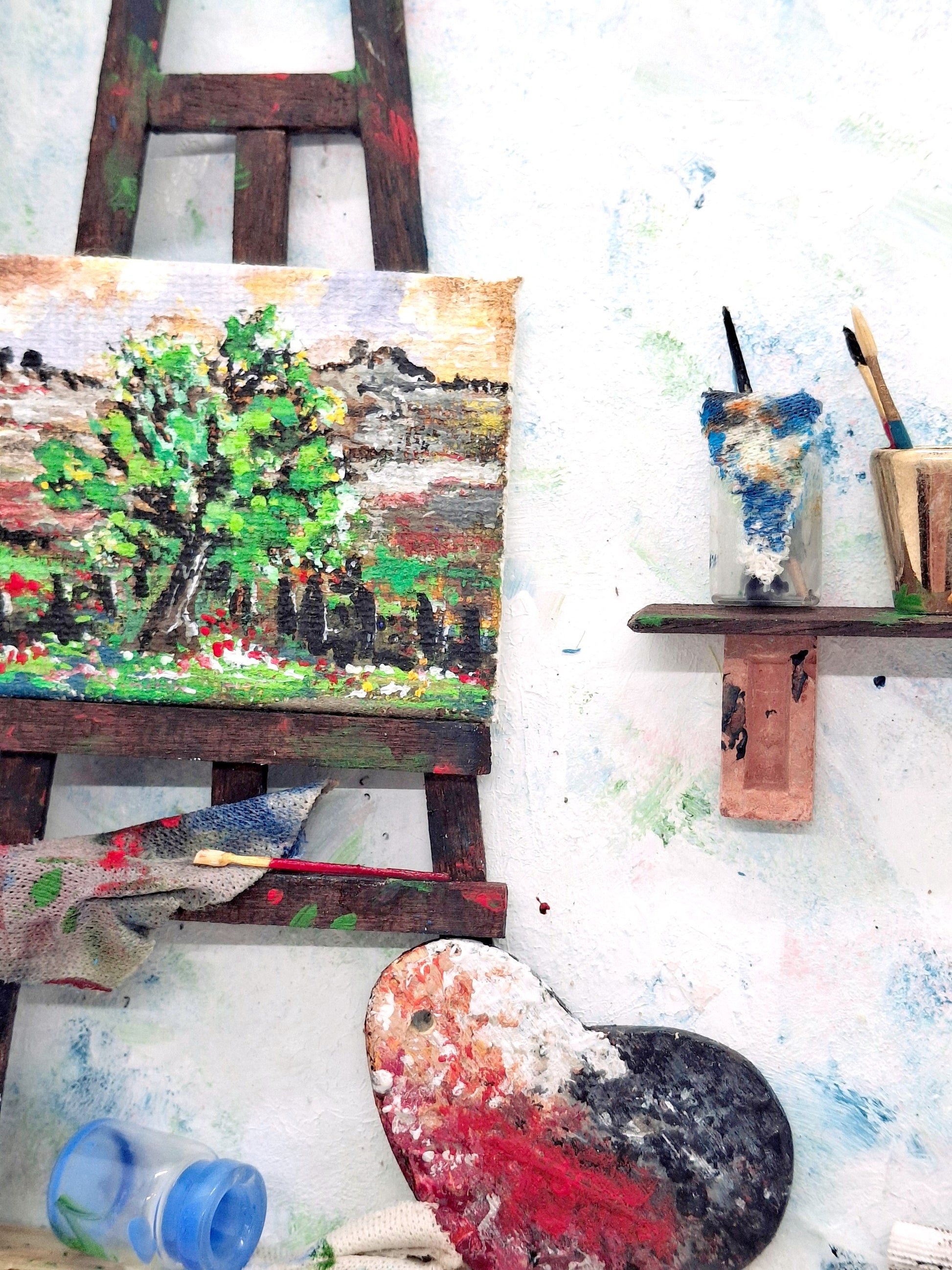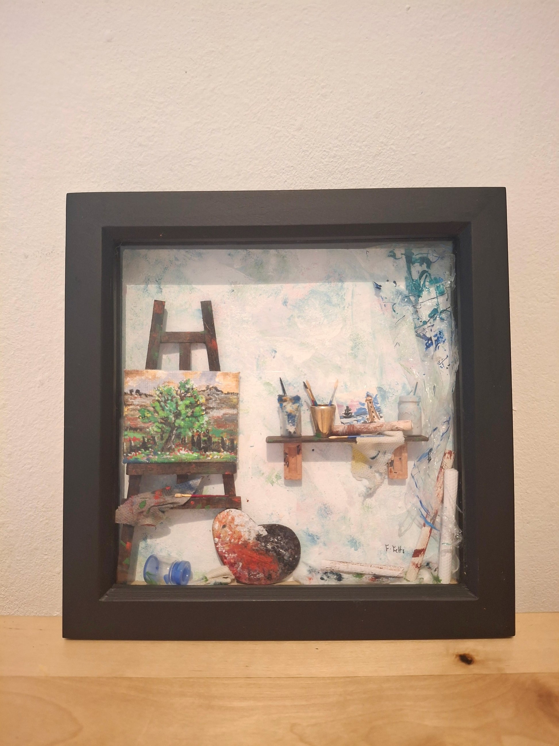 A handmade miniature art studio that is housed in a glass fronted box frame.