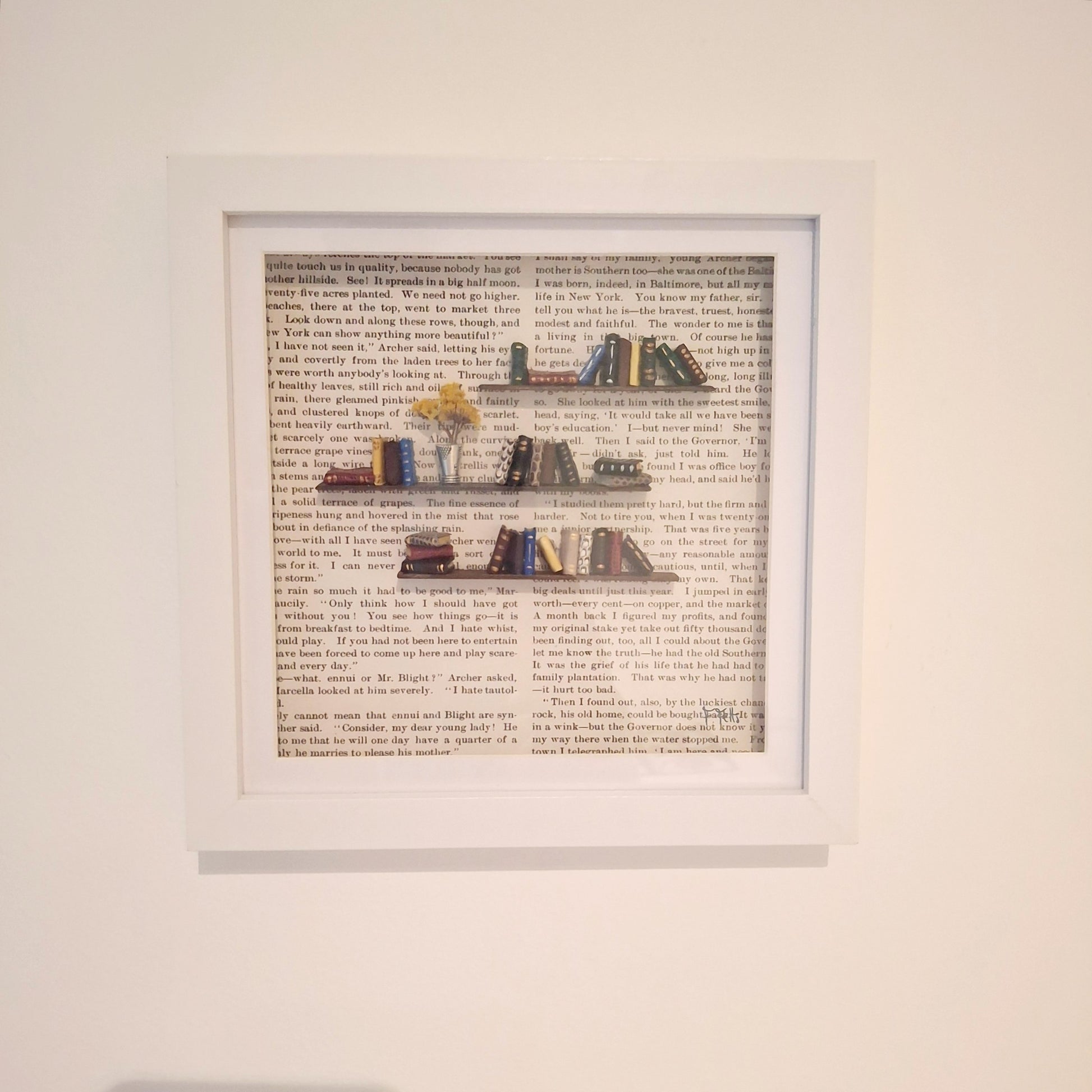 A handmade miniature book scene housed in a glass fronted box frame. Perfect as a gift for bibliophiles.