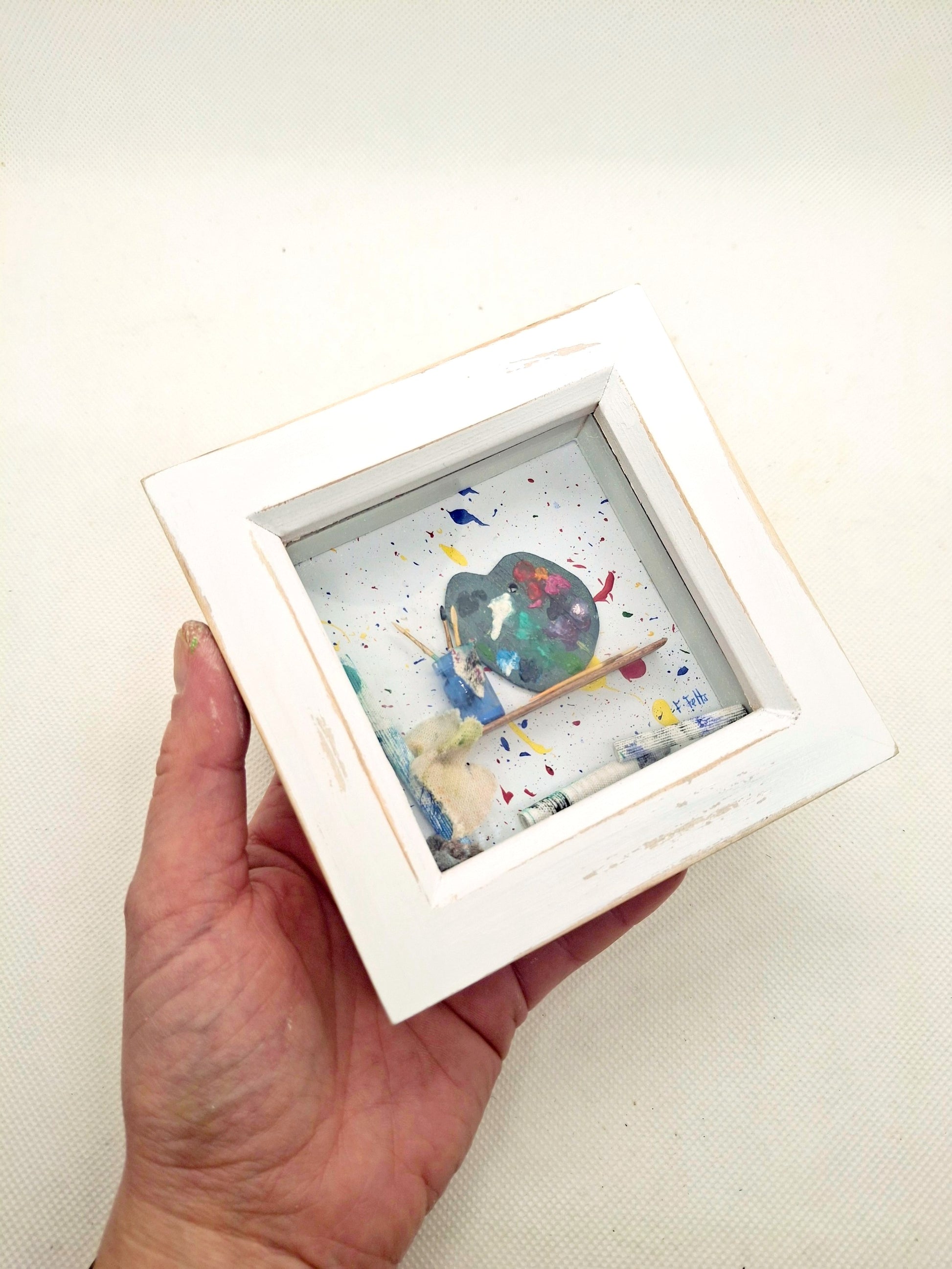 A handmade miniature artists scene housed in a glass fronted box frame.