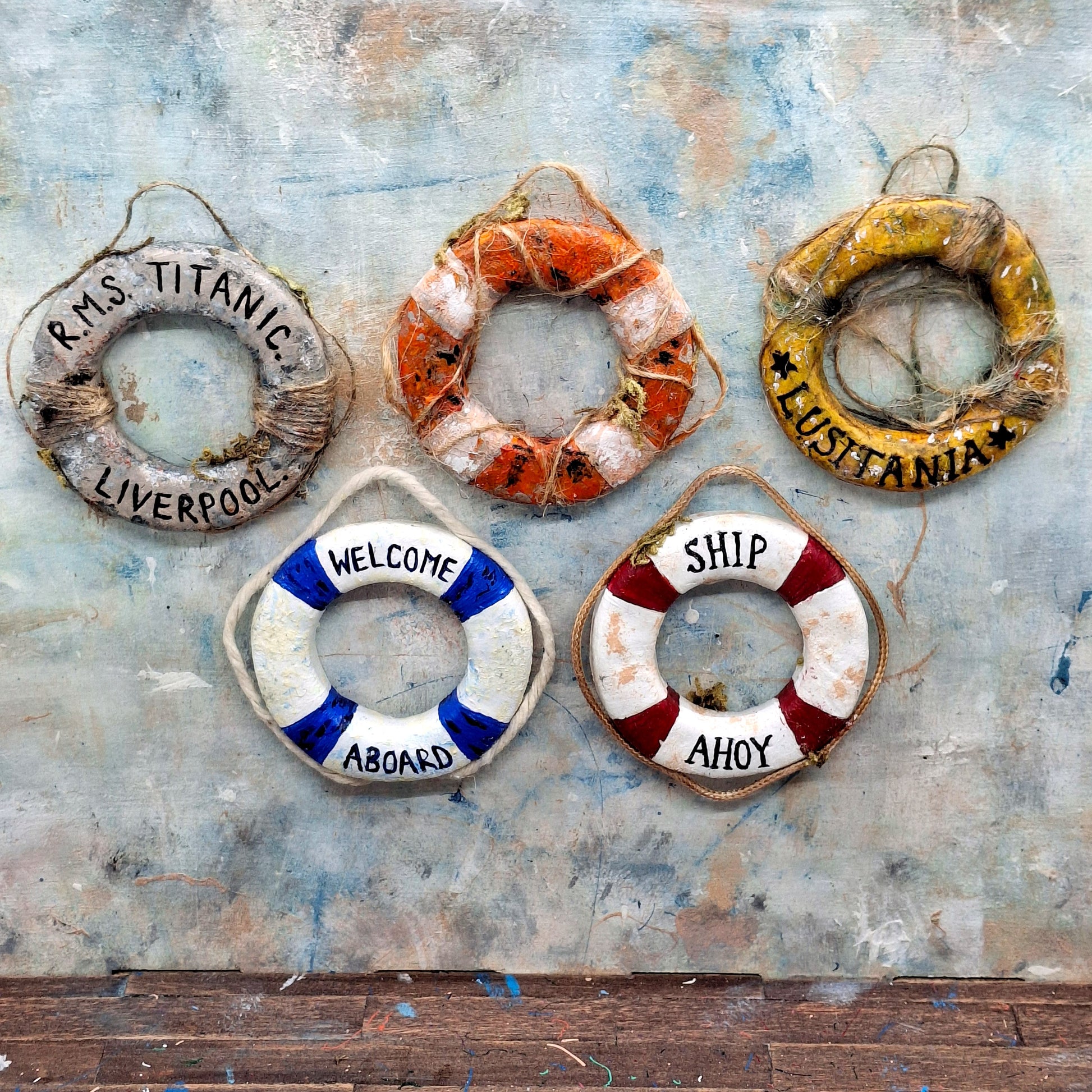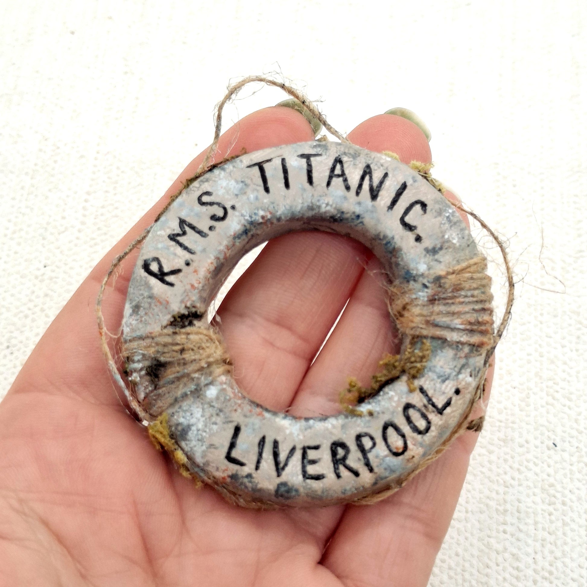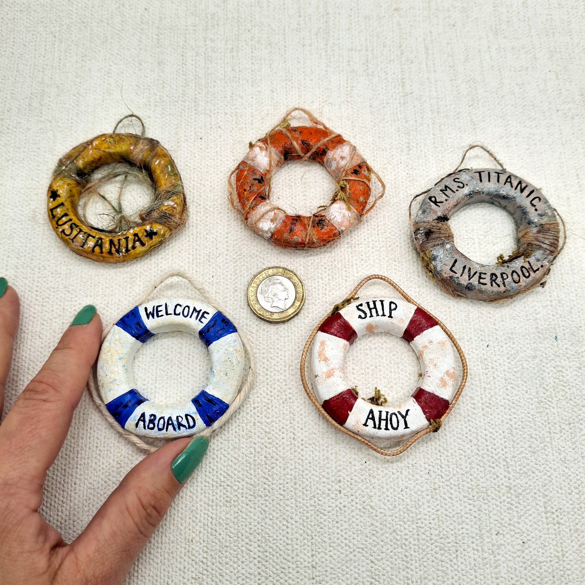 A 1:12th scale dolls house miniature life ring hand painted with "RMS TITANIC, LIVERPOOL". The life ring is made of clay and is finished with nautical rope and a light varnish.